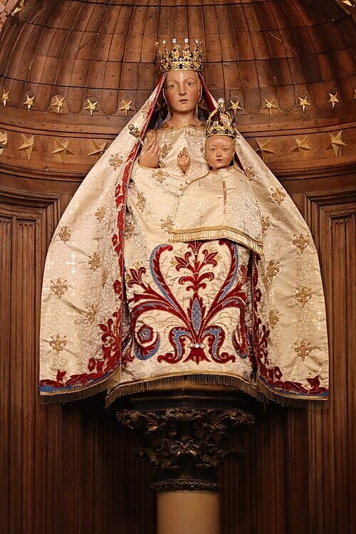 Fabriquée en bois au XVI ème siècle, Notre-Dame du Pilier représente la Vierge Marie à l’Enfant Jésus. Elle se situe dans le déambulatoire nord de la cathédrale.